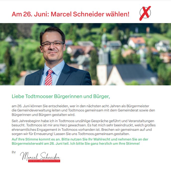 Marcel Schneider freut sich in einer ersten Stellungnahme sehr auf einen spannenden Wahlkampf sowie die Gespräche mit den Todtmooser Bürgerinnen und Bürgern. Der 42-jährige Kandidat: „Seitdem ich meine Kandidatur letztes Wochenende erklärt habe, durfte ich großen Zuspruch und viel Unterstützung aus der Todtmooser Bevölkerung erfahren. Das freut mich sehr und bestärkt mich in meiner Entscheidung, das schöne Todtmoos als Bürgermeister gut zu verwalten und erfolgreich gestalten zu wollen“.